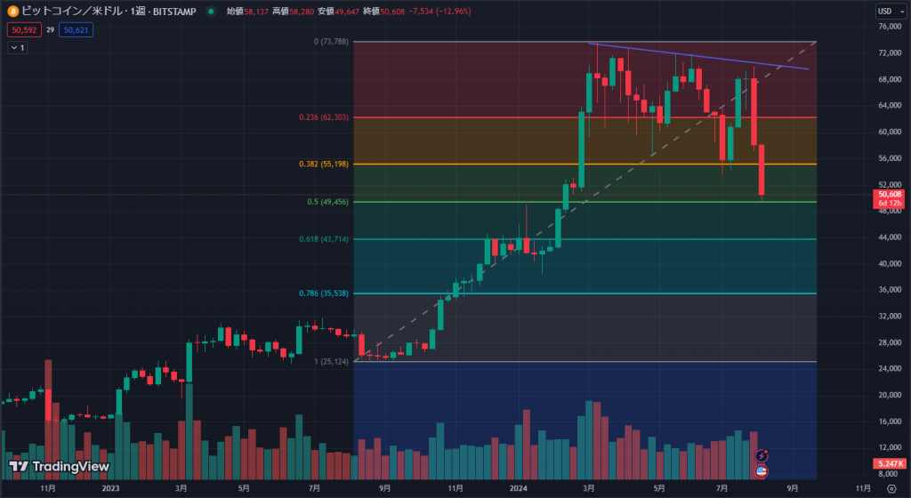 フィボナッチリトレースメント0.5(黄緑)のラインがサポートラインとして機能しています。