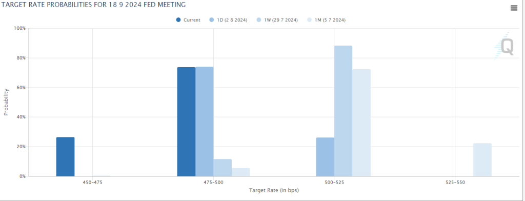 以下は、市場の予想ですが、24年9月は、4.75-5.00%になるとの見方濃厚となっています。