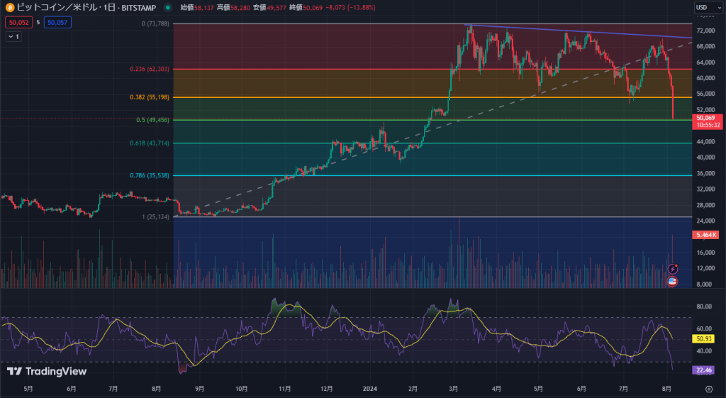 本日、ビットコイン価格が大幅に下落し、一時50,000ドル(約710万円)を割り込む事態となりました。この急落の背景と今後の見通しについて分析します。