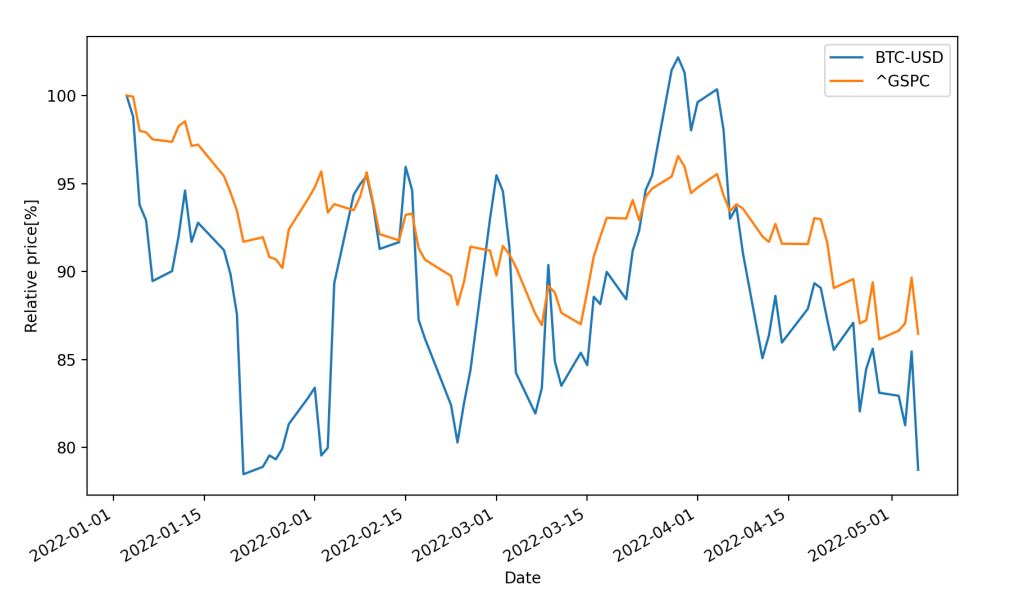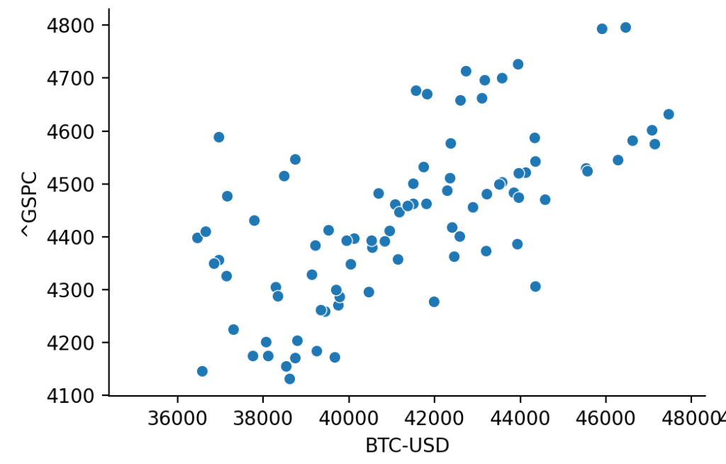 より両者の連動性を示すために、縦軸にS&P500、横軸にビットコインの価格をプロットします。