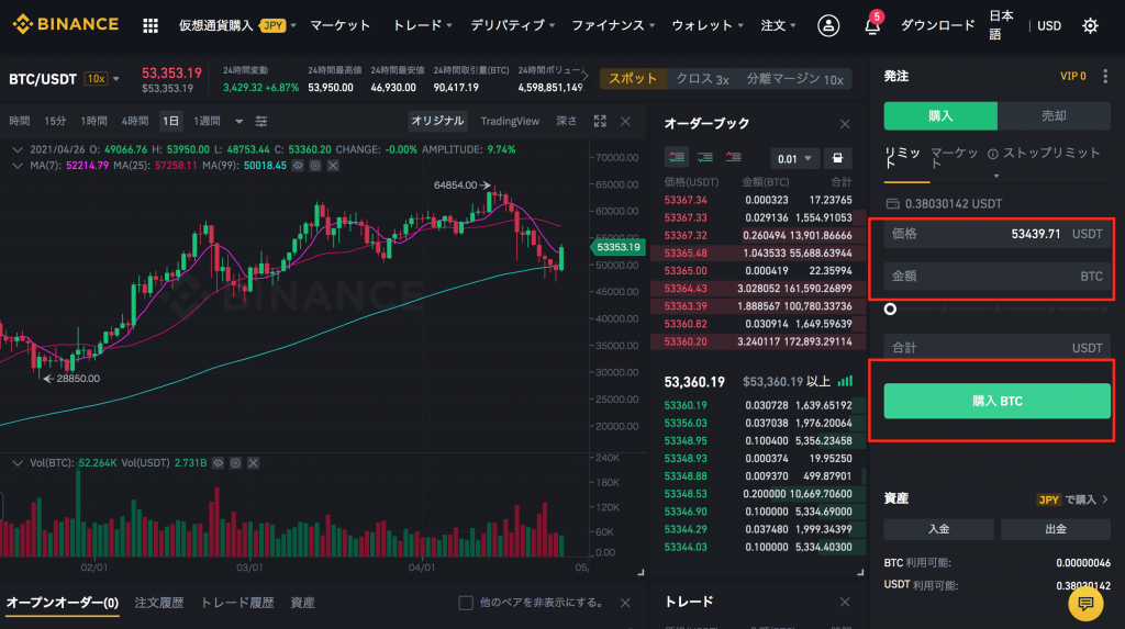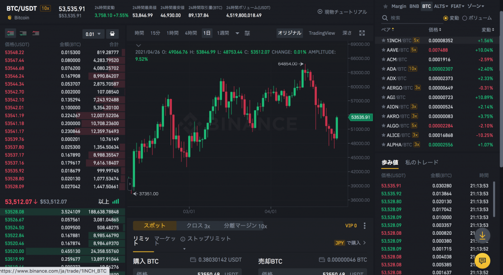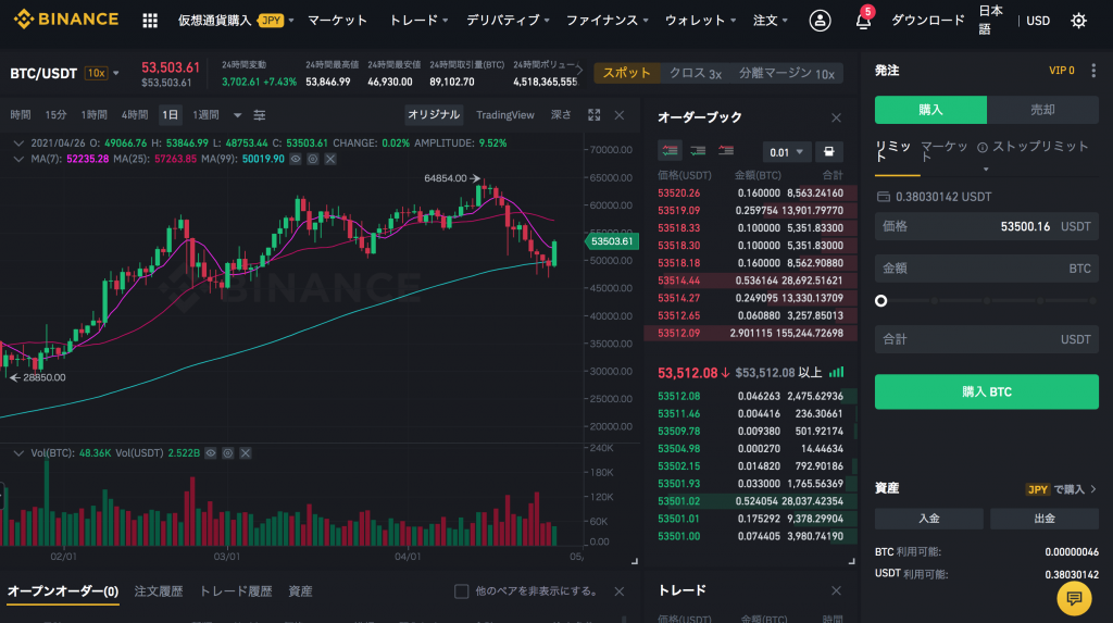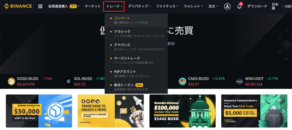 バイナンスでCAKEを購入するには、ホーム画面より「トレード」をクリックすることで可能です。