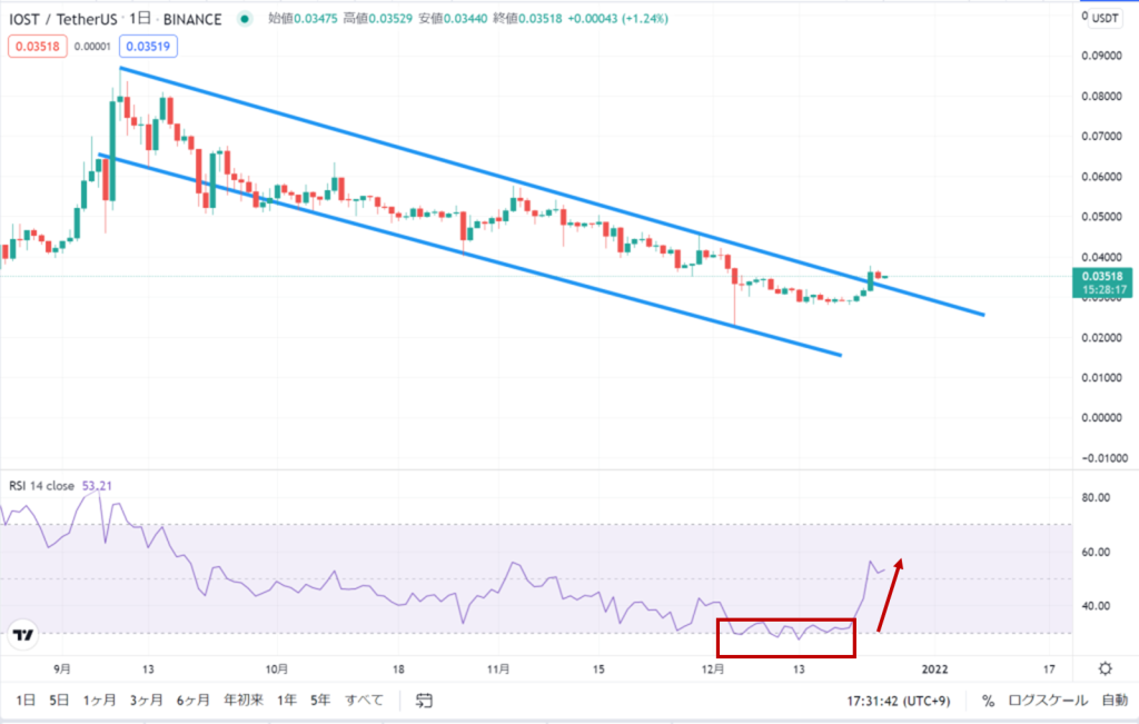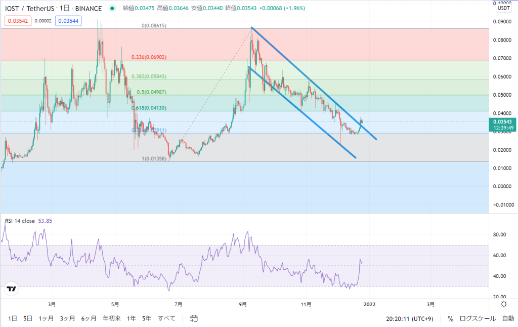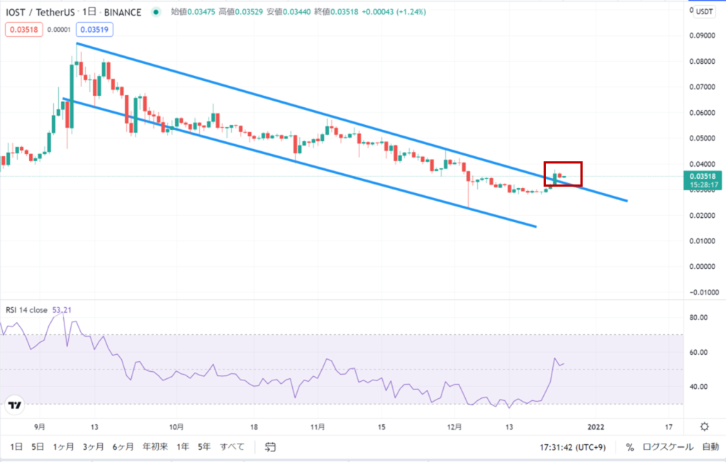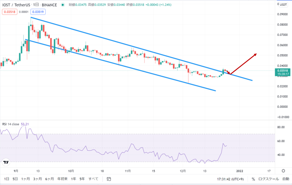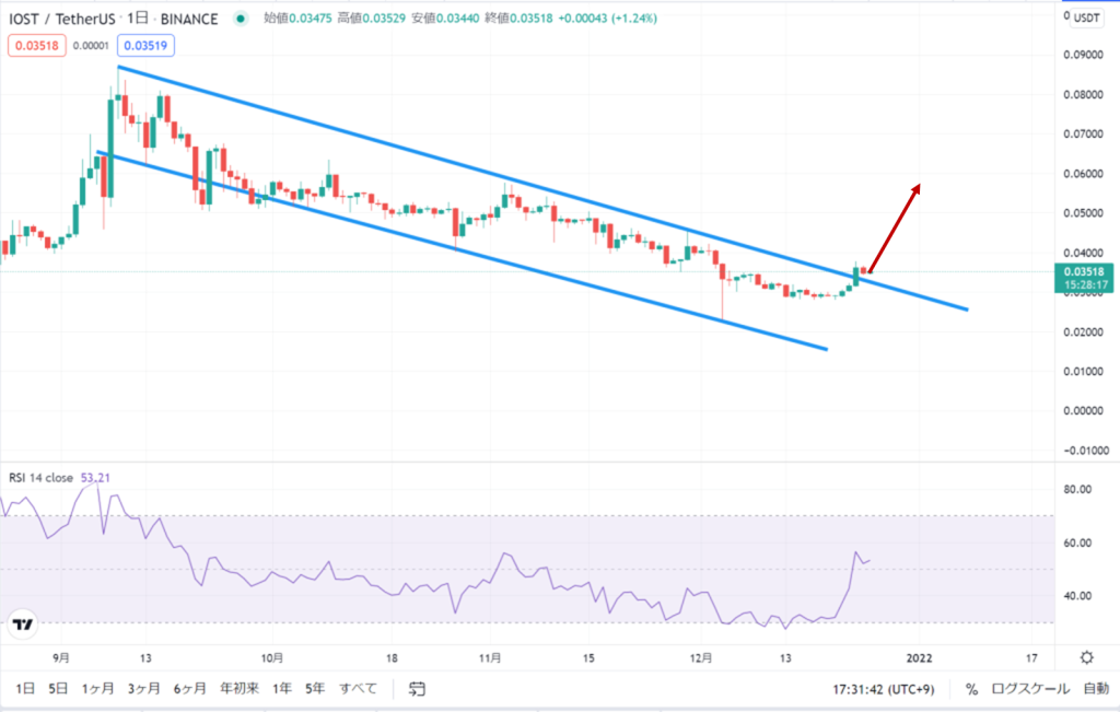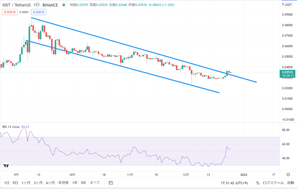 - IOSTの日足チャートから、ここ4か月程度続いた下落トレンドから抜け出した