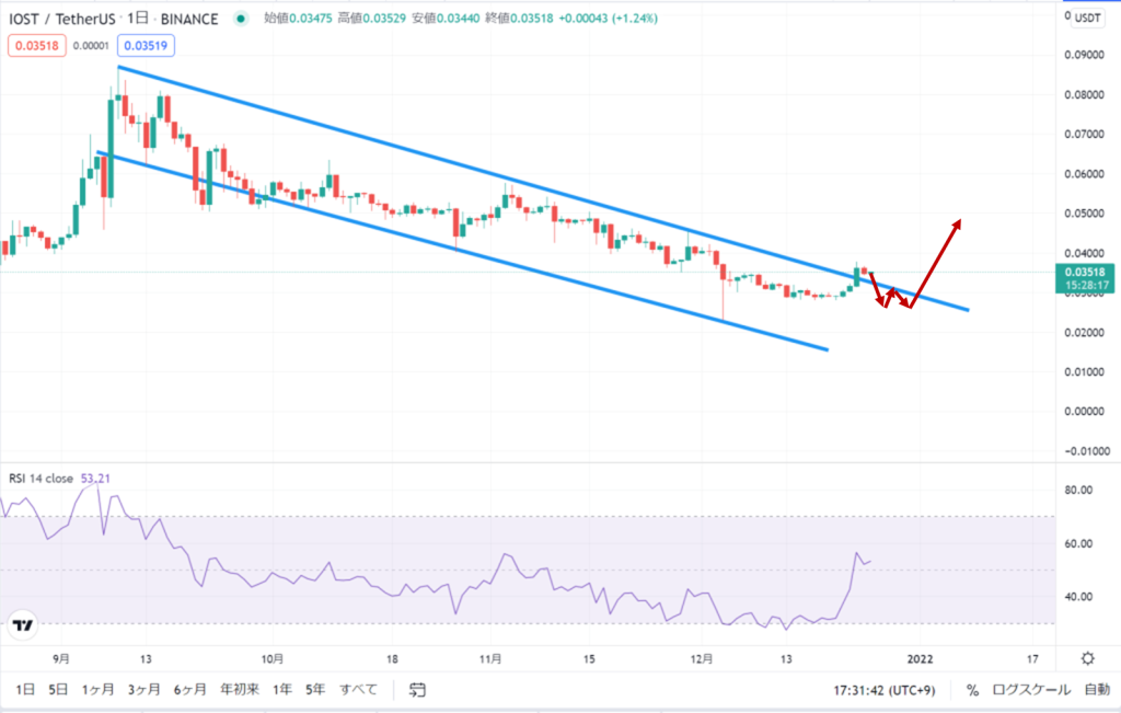 結論としては、ここからIOSTの価格は上昇の可能性が高いと判断します。