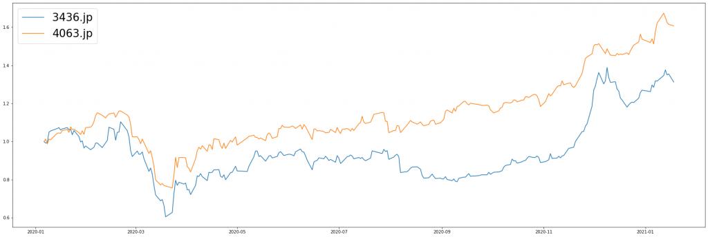 2020年1月6日のそれぞれの株価を1として、プロットしたのが以下のグラフです。