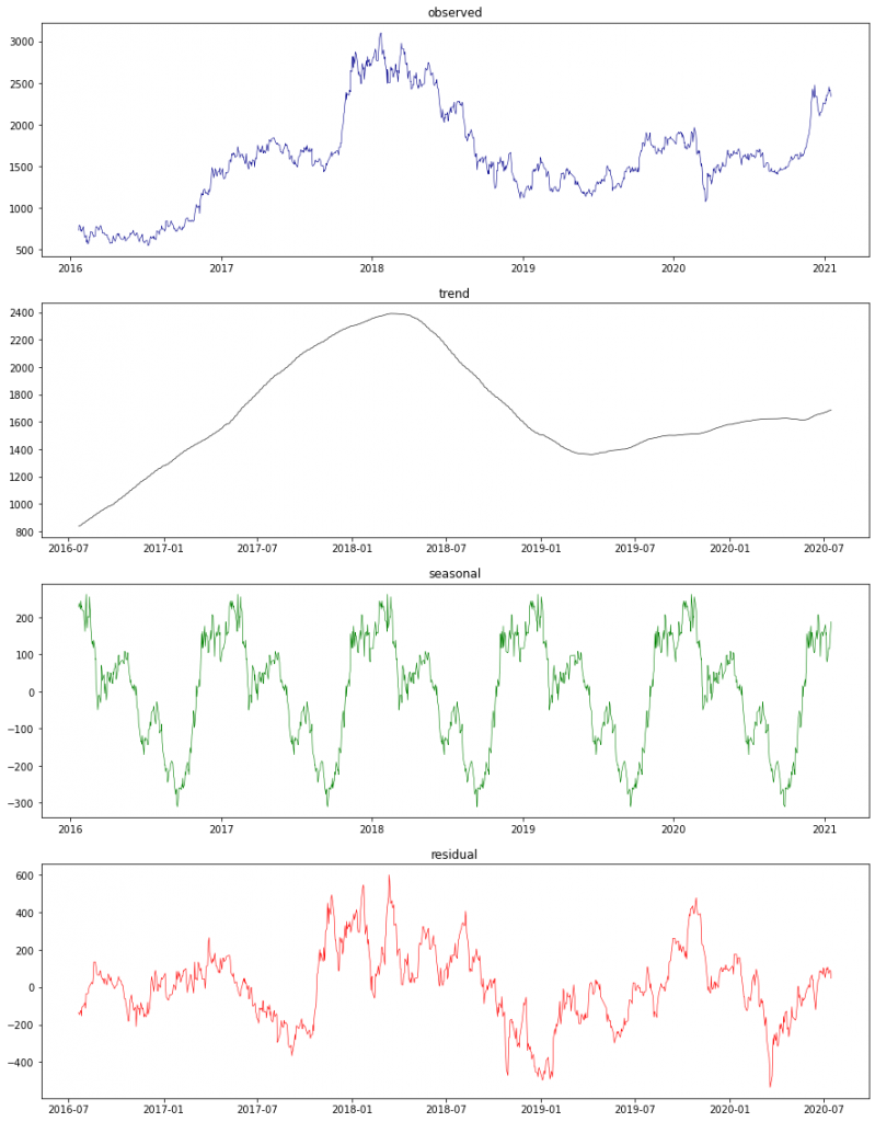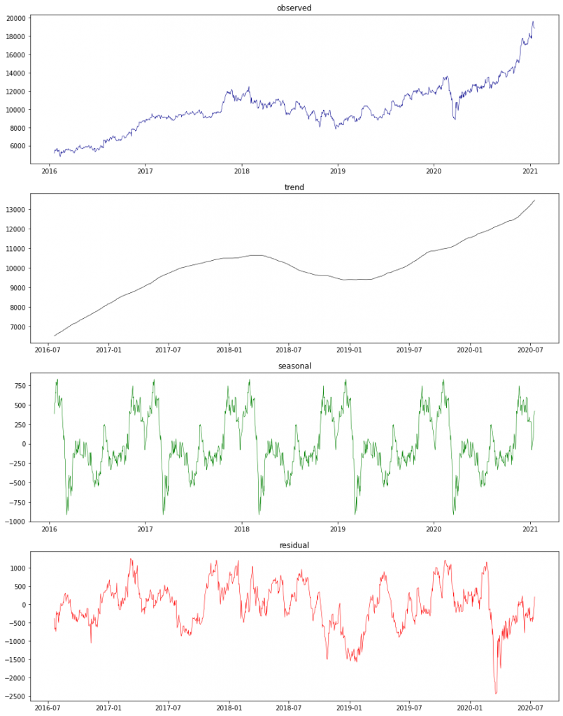• 季節変動データ(緑)より、年度末に株価を下げる傾向があることが分かります