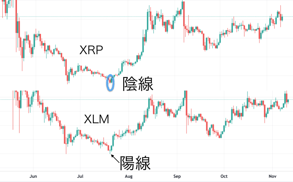 - XLMが陽線終わりにも関わらず、XRPが陰線