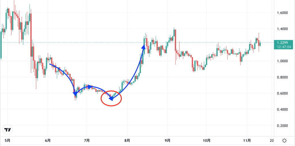 - ダブルボトムの場合は、二つ目の谷でが並んだタイミングで強い買いが入ることが多い