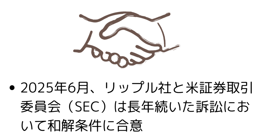 - 2025年6月:SECとの和解条件に合意。エスクロー預託中の1億2,500万ドルから5000万ドルをSECに支払うことで決着。XRPの非証券性も米司法で事実上確定し、米国上場や大型金融機関連携への期待が高まる。